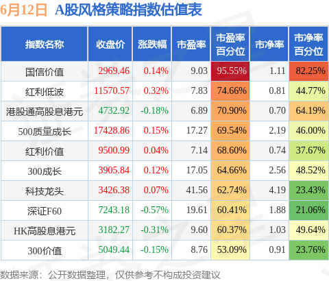 风格策略指数方面,国信价值的市盈率百分位较高,为95.55%。而300价值的市盈率百分位较低,为53.09%。