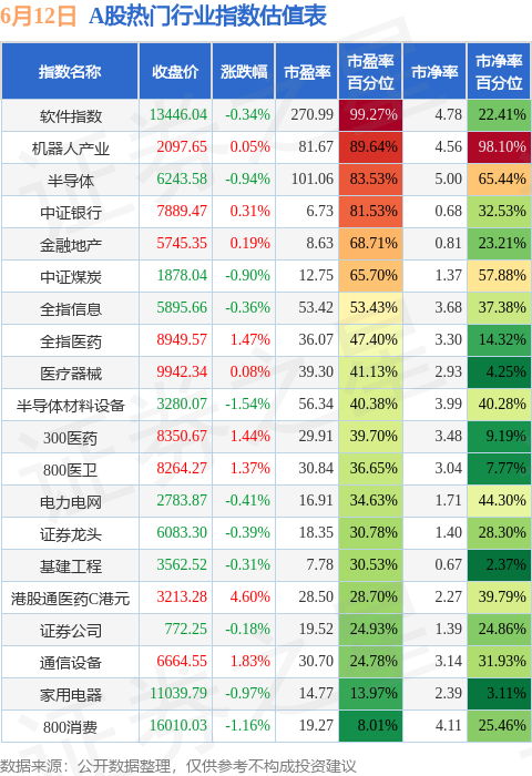 热门行业指数方面,软件指数的市盈率百分位较高,为99.27%。而800消费的市盈率百分位较低,为8.01%。